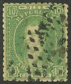 120 ARGENTINA - RIVADAVIAS Sello suelto / Usado N°Cat.: GJ.23 Valor de catál.: 30,00 Buena-MB GJ.23, 10c. Impresión semiborrosa, con triple matasello puntos Precio inicial: US$ 15 Precio actual: US$ 15 Oferte US$ 15 o más