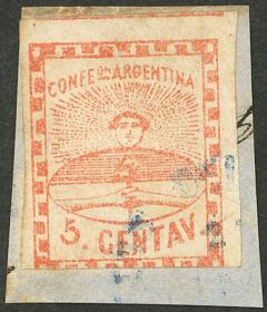 54 ARGENTINA - CONFEDERACIÓN Sello suelto / Usado N°Cat.: GJ.1 Valor de catál.: 40,00 MB. GJ.1, 5c Cifras Chicas, con matasello de Córdoba en semicírculo con FRANCA, firmado G. Jalil, con VARIEDAD : colita en el ángulo inferior derecho, excelente calidad!! Precio inicial: US$ 20 Precio actual: US$ 20 Oferte US$ 20 o más