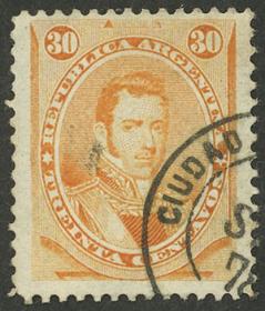 178 ARGENTINA - EMISIONES GENERALES Sello suelto / Usado N°Cat.: GJ.42 Valor de catál.: 20,00 MB. GJ.42, 30c. Alvear, finamente matasellado, MB!! Precio inicial: US$ 10 Precio actual: US$ 10 Oferte US$ 10 o más