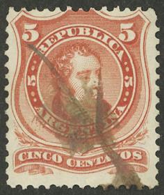 141 ARGENTINA - RIVADAVIAS Sello suelto / Sin usar (sin goma) N°Cat.: GJ.25a Valor de catál.: 120,00 Aceptable-Buena GJ.25a, 5c 4ª tirada SIN USAR, con DOBLE impresión total, izquierda extremadamente separadas, con defecto en la parte superior, aunque es muy coleccionable Precio inicial: US$ 20 Precio actual: US$ 20 Oferte US$ 20 o más