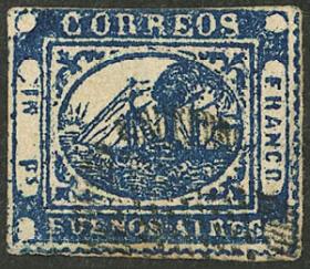 12 ARGENTINA - BARQUITOS Sello suelto / Usado N°Cat.: GJ.5 Valor de catál.: 165,00 Aceptable-Buena GJ.5, Dos Ps, color azul claro, con sus 4 filetes completos, tres márgenes tipo JUMBO, presenta una reparación en uno de los márgenes expertamente realizada, con matasello ponchito 10 x 10 de Bs As, extraordinario aspecto!!!! Precio inicial: US$ 45 Precio actual: US$ 45 Oferte US$ 50 o más