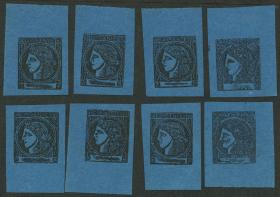 39 ARGENTINA - CORRIENTES Lote / Sin usar (sin goma) N°Cat.: GJ.7 Valor de catál.: 32,00 MB. GJ.7, 3c. Azul oscuro, los 8 diferentes tipos presentados sobre cartulina negra, todos de extraordinaria calidad y amplísimos márgenes!!! Precio inicial: US$ 20 Precio actual: US$ 20 Oferte US$ 20 o más