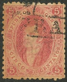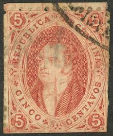164 ARGENTINA - RIVADAVIAS Sello suelto / Usado N°Cat.: GJ.34 Valor de catál.: 85,00 MB. GJ.34, 5c 8ª tirada con lindo color carmín rosa claro, de MB calidad!! Precio inicial: US$ 45 Precio actual: US$ 45 Oferte US$ 45 o más