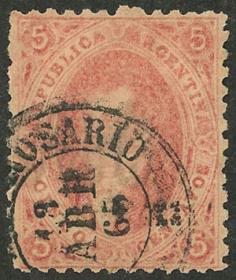 98 ARGENTINA - RIVADAVIAS Sello suelto / Usado N°Cat.: GJ.20 Valor de catál.: 20,00 MB. GJ.20, 5c 3ª tirada con matasello de Rosario en elipse bicóncava, MB!! Precio inicial: US$ 12 Precio actual: US$ 12 Oferte US$ 12 o más