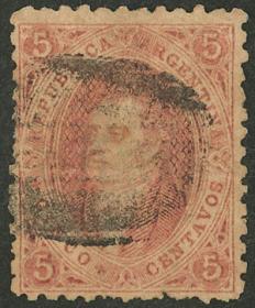 82 ARGENTINA - ESCUDITOS Sello suelto / Usado N°Cat.: GJ.15 Valor de catál.: 33,00 Buena-MB GJ.15, 5c con " C " de Centavos estrecha, con matasello " OM ", color rosa pálido, un margen justo Precio inicial: US$ 10 Precio actual: US$ 10 Oferte US$ 10 o más