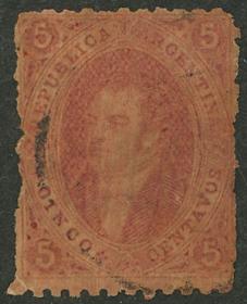 166 ARGENTINA - RIVADAVIAS Sello suelto / Usado N°Cat.: GJ.34 Valor de catál.: 85,00 Aceptable-Buena GJ.34, 5c 8ª tirada, impresión nítida, leves peladuritas al dorso, muy buen frente, raro Precio inicial: US$ 25 Precio actual: US$ 25 Oferte US$ 25 o más
