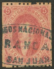 90 ARGENTINA - RIVADAVIAS Sello suelto / Usado N°Cat.: GJ.19 Valor de catál.: 30,00 MB. GJ.19, 5c 1ª tirada con matasello de San Juan con FRANCA perfectamente aplicado, MB Precio inicial: US$ 15 Precio actual: US$ 15 Oferte US$ 17 o más