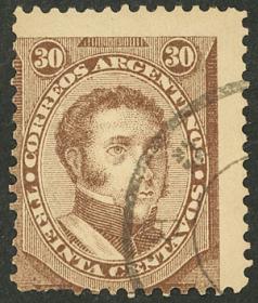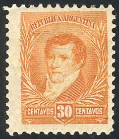 221 ARGENTINA - EMISIONES GENERALES Sello suelto / Usado N°Cat.: GJ.91A Valor de catál.: 150,00 MB. GJ.91A, 30c. Dorrego color CHOCOLATE ROJIZO, excelente sello con VARIEDAD : dentado desplazado, raro y de extraordinaria calidad!! Precio inicial: US$ 75 Precio actual: US$ 75 Oferte US$ 75 o más