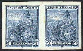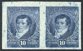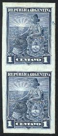 292 ARGENTINA - EMISIONES GENERALES Pareja / N°Cat.: GJ.187 Aceptable-Buena GJ.187, pareja, PRUEBA de impresión sobre cartón satinado, en color celeste (V.K. 1958 Tomo II pág. 694), leves manchitas Precio inicial: US$ 5 Precio actual: US$ 5 Oferte US$ 5 o más
