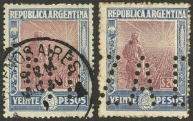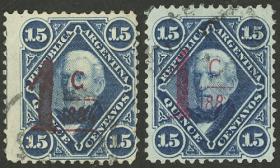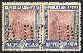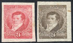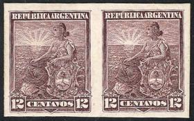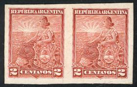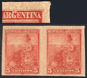 307 ARGENTINA - EMISIONES GENERALES Pareja / N°Cat.: GJ.222 Buena-MB GJ.222, en pareja, PRUEBA de impresión sobre cartón opaco, en color rojo (V.K. 1958 Tomo II pág. 696), uno con VARIEDAD: marco roto sobre la "G" de ARGENTINA, MB calidad!! Precio inicial: US$ 25 Precio actual: US$ 25 Oferte US$ 25 o más