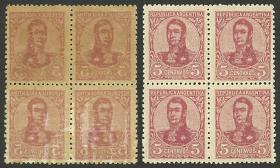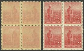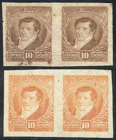 266 ARGENTINA - EMISIONES GENERALES Lote / N°Cat.: GJ.143 Buena-MB GJ.143, 2 parejas, PRUEBAS de impresión sobre papel delgado, en diferentes colores (V.K. 1958 Tomo II pág. 694), MB!! Precio inicial: US$ 15 Precio actual: US$ 15 Oferte US$ 15 o más