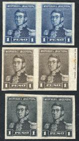 272 ARGENTINA - EMISIONES GENERALES Lote / N°Cat.: GJ.148 Buena-MB GJ.148, 3 parejas, PRUEBAS de impresión sobre papel delgado, en diferentes colores (V.K. 1958 Tomo II pág. 694), MB!! Precio inicial: US$ 30 Precio actual: US$ 30 Oferte US$ 30 o más