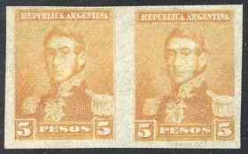 260 ARGENTINA - EMISIONES GENERALES Pareja / N°Cat.: GJ.139 Buena-MB GJ.139, pareja con BdH y leyenda del impresor, PRUEBA de impresión sobre papel delgado con filigrana "SCHREIBMASCHINEN-PAPIER", en color naranja (V.K. 1958 Tomo II pág. 694), MB!! Precio inicial: US$ 10 Precio actual: US$ 10 Oferte US$ 10 o más