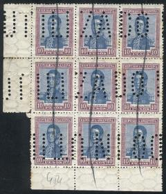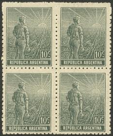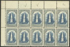 334 ARGENTINA - EMISIONES GENERALES Multiplo / Nuevo Mint N°Cat.: GJ.300 MB. GJ.300, bloque de 10 EdH, varios ejemplares con VARIEDADES: puntitos o rayas en color azul, producidas por no haber sido bien limpiada la plancha Precio inicial: US$ 10 Precio actual: US$ 10 Oferte US$ 10 o más