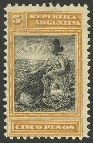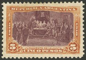 341 ARGENTINA - EMISIONES GENERALES Sello suelto / Nuevo con bisagra N°Cat.: GJ.313 Valor de catál.: 80,00 MB. GJ.313, $5, Centenario de la Revolución de 1810 Precio inicial: US$ 45 Precio actual: US$ 45 Oferte US$ 45 o más