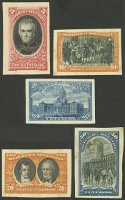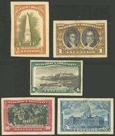 339 ARGENTINA - EMISIONES GENERALES Lote / N°Cat.: GJ.305 y otros MB. GJ.305 y otros, 5 PRUEBAS de impresión de distintos valores de la serie sobre papel mediano liso, en diferentes combinaciones de colores, MB Precio inicial: US$ 10 Precio actual: US$ 10 Oferte US$ 10 o más