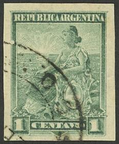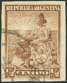 298 ARGENTINA - EMISIONES GENERALES Sello suelto / Usado N°Cat.: GJ.217 MB. GJ.217, ½c Libertad con Escudo, sin dentar Precio inicial: US$ 10 Precio actual: US$ 10 Oferte US$ 10 o más