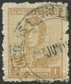 299 ARGENTINA - EMISIONES GENERALES Sello suelto / Usado N°Cat.: GJ.218 MB. GJ.218, ejemplar SIN DENTAR proveniente de una pareja cuyo valor de catálogo es US$ 100, escaso!! Precio inicial: US$ 25 Precio actual: US$ 25 Oferte US$ 25 o más