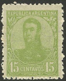 218 ARGENTINA - EMISIONES GENERALES Sello suelto / Nuevo con bisagra N°Cat.: GJ.88 Valor de catál.: 40,00 MB. GJ.88, 15c. San Martín, goma muy fresca, MB Precio inicial: US$ 25 Precio actual: US$ 25 Oferte US$ 25 o más