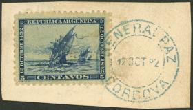 252 ARGENTINA - EMISIONES GENERALES Pieza / Usado N°Cat.: GJ.136 MB. GJ.136, sobre fragmento, con matasello " GENERAL PAZ " ( Córdoba ), en color azul Precio inicial: US$ 10 Precio actual: US$ 10 Oferte US$ 10 o más