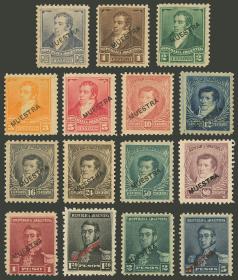 286 ARGENTINA - EMISIONES GENERALES Serie / Sin usar (sin goma) N°Cat.: GJ.174 y otros Buena-MB GJ.174 y otros, Serie Tres Próceres, 15 valores de la serie ( falta solamente el 30c ), con sobrecarga " MUESTRA " ( hay con filigrana sol chico y sol grande ), de buena a MB calidad!! Precio inicial: US$ 40 Precio actual: US$ 40 Oferte US$ 40 o más