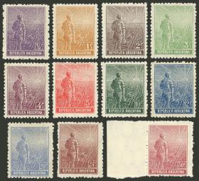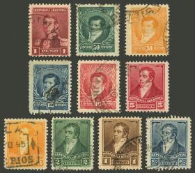 294 ARGENTINA - EMISIONES GENERALES Serie / Usado N°Cat.: GJ.190 Valor de catál.: 31,25 Buena-MB GJ.190/196+199/200+202, filigrana sol grande, dentado 12¼, 10 valores de la serie Precio inicial: US$ 15 Precio actual: US$ 15 Oferte US$ 15 o más
