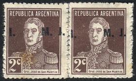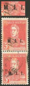 1055 ARGENTINA - OFICIALES Pareja / Nuevo con bisagra N°Cat.: GJ.410c Buena-MB GJ.410c, pareja reunida con VARIEDADES: sobrecarga desplazada + "I" caída, MB Precio inicial: US$ 10 Precio actual: US$ 10 Oferte US$ 10 o más