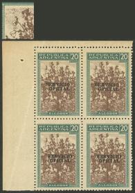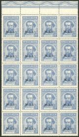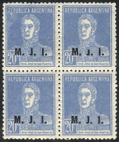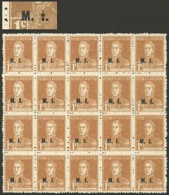 1048 ARGENTINA - OFICIALES Multiplo / Nuevo o Nuevo Mint N°Cat.: GJ.307 Valor de catál.: US$ +38 Buena-MB GJ.307, bloque de 20, dentado 13¼ x 12½, un sello con VARIEDAD : " I " rota ( producida por un grumo de tinta ), valor del bloque tipo US$38 Precio inicial: US$ 20 Precio actual: US$ 20 Oferte US$ 20 o más