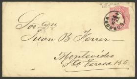 1171 ARGENTINA - ENTEROS POSTALES Sobre / Usado N°Cat.: SOB-5 Valor de catál.: US$ +250 Buena SOB-5, Sobre de 8c., en papel LISO, enviado desde Córdoba a Montevideo el 8 de Marzo 1883, con paso por Bs As, al dorso matasello de arribo, RARO!!! Precio inicial: US$ 125 Precio actual: US$ 125 Oferte US$ 125 o más