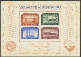 1014 ARGENTINA - BLOCKS Bloque conmemorativo / Sin usar (sin goma) N°Cat.: GJ.11 Valor de catál.: US$ 12 MB. GJ.11, ( barco, tren, caballo ), Bicentenario de la Implantación del Correo Fijo en el Río de la Plata Precio inicial: US$ 4 Precio actual: US$ 4 Oferte US$ 4 o más