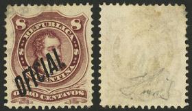 1035 ARGENTINA - OFICIALES Sello suelto / Usado N°Cat.: GJ.16A Valor de catál.: US$ (500) Buena-MB GJ.16A, 8c. Borravino, rarísimo sello, no catalogado usado y posiblemente sea el único en existencia, ínfima peladurita al dorso en una esquina, apenas visible y que solo menciono para ser exacto en la descripción, totalmente sin importancia. Con la firma de Victor Kneitschel al dorso. Precio inicial: US$ 400 Precio actual: US$ 400 Oferte US$ 400 o más