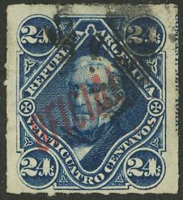 1041 ARGENTINA - OFICIALES Sello suelto / Usado N°Cat.: GJ.32 Valor de catál.: US$ 25 Buena GJ.32, 24c. San Martín con sobrecarga rosa carmín ( anilina ) Precio inicial: US$ 12 Precio actual: US$ 12 Oferte US$ 12 o más