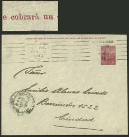 1181 ARGENTINA - ENTEROS POSTALES Entero postal / Usado N°Cat.: SOB-62a Valor de catál.: US$ 10 MB. SOB-62a, Sobre de 5c. Labrador enviado en Bs As el 2 de Febrero de 1912, con VARIEDAD : " Cobrará " con acento grave Precio inicial: US$ 5 Precio actual: US$ 5 Oferte US$ 5 o más