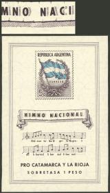 1009 ARGENTINA - BLOCKS Bloque conmemorativo / Nuevo Mint N°Cat.: GJ.09 MB. GJ.09, con VARIEDAD : rayado defectuoso bajo " O N " de HIMNO NACIONAL Precio inicial: US$ 20 Precio actual: US$ 20 Oferte US$ 20 o más