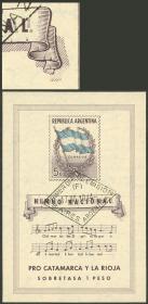 1010 ARGENTINA - BLOCKS Bloque conmemorativo / Usado N°Cat.: GJ.09 MB. GJ.09, con matasello primer día, VARIEDAD : borrado del rayado en el sombreado de la banda a la derecha Precio inicial: US$ 10 Precio actual: US$ 10 Oferte US$ 10 o más