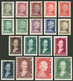 1083 ARGENTINA - OFICIALES Serie / Nuevo con bisagra N°Cat.: GJ.685/702 Valor de catál.: US$ 100 MB. GJ.685/702, Eva Perón, serie completa ( 18 v. ), MB!! Precio inicial: US$ 50 Precio actual: US$ 50 Oferte US$ 50 o más