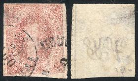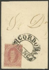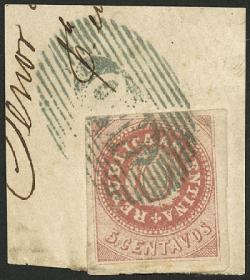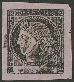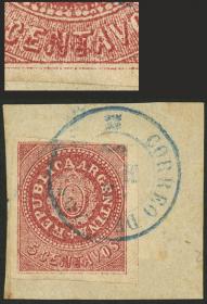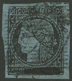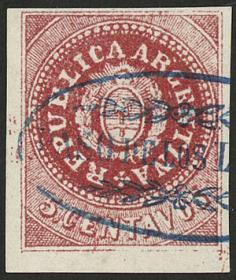 23 ARGENTINA - CORRIENTES Sello suelto / Usado N°Cat.: GJ.2 Valor de catál.: US$1.100++ Buena GJ.2, 1860 Provisorio con el valor tachado a pluma con DOBLE OBLITERACIÓN: matasello mudo de Corrientes "16 barras paralelas" + matasello particular del remitente, rarísimo, con certificado de Alberto Solari Precio inicial: US$ 450 Precio actual: US$ 450 Oferte US$ 496 o más