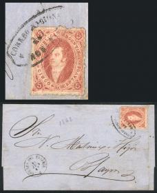 62 ARGENTINA - RIVADAVIAS Sobre / N°Cat.: GJ.25 MB. GJ.25, 4ª Tirada, magnífico ejemplar nítido y de color rosa oscuro violáceo muy notable, franqueando una carta completa enviada el 23/MAY/1866 a Valparaíso, con mat. oval de MENDOZA, lujo! Precio inicial: US$ 275 Precio actual: US$ 275 Oferte US$ 275 o más