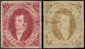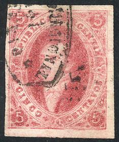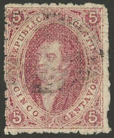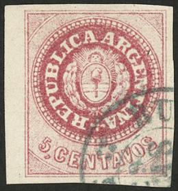 39 ARGENTINA - ESCUDITOS Sello suelto / Usado N°Cat.: GJ.15A MB. GJ.15A, 5c. Con la C estrecha, color ROJO MORADO, excelente calidad, raro! Precio inicial: US$ 45 Precio actual: US$ 45 Oferte US$ 50 o más