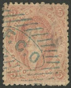 38 ARGENTINA - ESCUDITOS Pieza / Usado N°Cat.: GJ.15 var. MB. RARO COLOR: GJ.15, 5c. Con la C estrecha color rosa SALMÓN, hermoso sello de márgenes muy amplios sobre fragmento con matasello OM, excelente! Precio inicial: US$ 50 Precio actual: US$ 50 Oferte US$ 50 o más