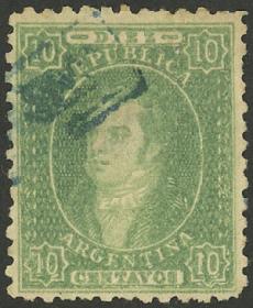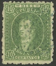 51 ARGENTINA - RIVADAVIAS Sello suelto / Usado N°Cat.: GJ.21 MB. GJ.21, 10c. Impresión nítida, con matasello NO IDENTIFICADO "puntos chicos" en color azul, MB calidad! Precio inicial: US$ 60 Precio actual: US$ 60 Oferte US$ 60 o más