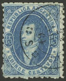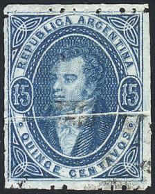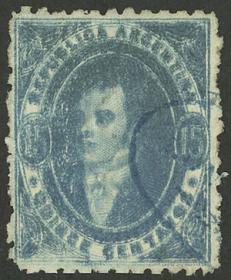 32 ARGENTINA - ESCUDITOS Sello suelto / Usado N°Cat.: GJ.9 Valor de catál.: US$245 MB. GJ.9, 15c. Azul verdoso, raro ejemplar de impresión borrosa y muy cargada, muy interesante! Precio inicial: US$ 150 Precio actual: US$ 150 Oferte US$ 150 o más