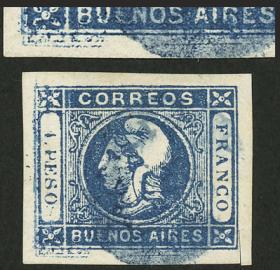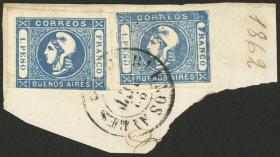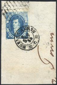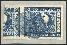 11 ARGENTINA - CABECITAS Pieza / Usado N°Cat.: GJ.17 MB. GJ.17, 1P. Azul, pareja formada por un sello completo + otro bisectado verticalmente, sobre fragmento con matasello de San Nicolás "ponchito" azul, excelente calidad, muy raro. Este fragmento único está mencionado en el catálogo de Victor Kneitschel 1974, página 116 Precio inicial: US$ 500 Precio actual: US$ 500 Oferte US$ 500 o más