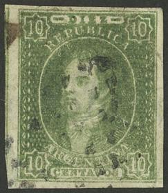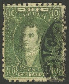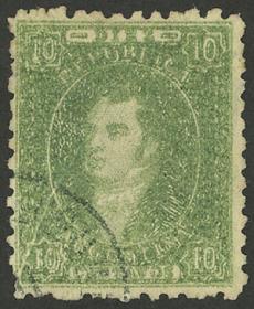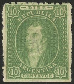 50 ARGENTINA - RIVADAVIAS Sello suelto / Nuevo con bisagra N°Cat.: GJ.21 Valor de catál.: US$360 MB. GJ.21, 10c. Verde, IMPRESIÓN MUY NÍTIDA, nuevo con goma original (+100%), muy buena calidad, raro así. Valor de catálogo US$360 Precio inicial: US$ 200 Precio actual: US$ 200 Oferte US$ 200 o más