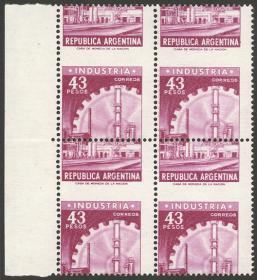 179 ARGENTINA - EMISIONES GENERALES Multiplo / Nuevo Mint N°Cat.: GJ.1146 var. MB. GJ.1146, 22P. Industria impreso en huecograbado (color azul violáceo), bloque de 6 con el dentado muy desplazado: "INDUSTRIA" en la parte inferior de cada sello, magnífico! Precio inicial: US$ 60 Precio actual: US$ 60 Oferte US$ 60 o más
