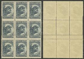 151 ARGENTINA - EMISIONES GENERALES Multiplo / Nuevo Mint N°Cat.: GJ.893 var. MB. GJ.893, 20c. Toro sin filigrana, bloque de 9 con DOBLE DENTADO CENTRAL, MB calidad! Precio inicial: US$ 50 Precio actual: US$ 50 Oferte US$ 50 o más