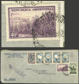 130 ARGENTINA - EMISIONES GENERALES Sobre / N°Cat.: GJ.764+otros Buena-MB PERFINS: Sobre aéreo enviado el 12/DIC/1941 de Buenos Aires a New York vía PANAGRA, con atractivo franqueo de 14,45P., todos los sellos tienen perforación comercial "ACO" del Frigorífico Armour de La Plata S.A., MB! Precio inicial: US$ 50 Precio actual: US$ 50 Oferte US$ 50 o más