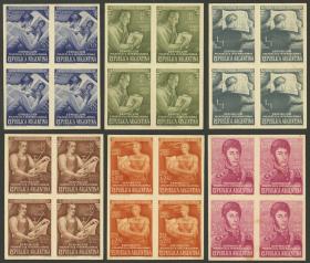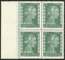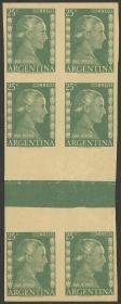 157 ARGENTINA - EMISIONES GENERALES Multiplo / N°Cat.: GJ.1007 MB. GJ.1007, 1952 25c. Eva Perón, prueba en el color original impresa sobre papel ordinario para muestras, bloque de 6 sellos CON ENTRECINTA horizontal, muy buena calidad, raro! Precio inicial: US$ 90 Precio actual: US$ 90 Oferte US$ 90 o más