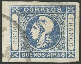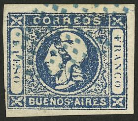 13 ARGENTINA - CABECITAS Sello suelto / Usado N°Cat.: GJ.17A Valor de catál.: US$140+150% MB. GJ.17A, 1P. Azul ÍNDIGO, muy bonito ejemplar con matasello azul de Buenos Aires puntos 9x10 (+150%), MB calidad, raro! Precio inicial: US$ 100 Precio actual: US$ 100 Oferte US$ 100 o más