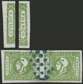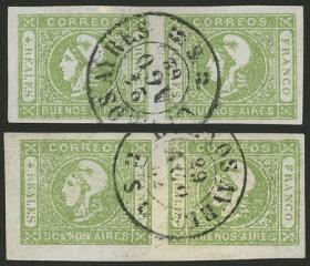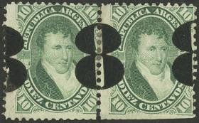 7 ARGENTINA - CABECITAS Pareja / Usado N°Cat.: GJ.16a Valor de catál.: US$1.300+ MB. RARA PAREJA: GJ.16a, 4R. Verde, pareja con DOBLE IMPRESIÓN (se nota claramente en las letras de los cartuchos verticales), de márgenes amplios y gran frescura, con matasello azul puntos de Bs.Aires, lujo! Precio inicial: US$ 450 Precio actual: US$ 450 Oferte US$ 450 o más
